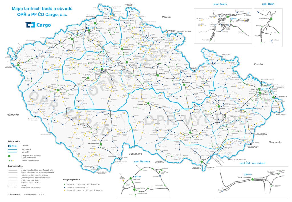Jde o síť tarifních bodů, ve kterých ČD Cargo standardně nabízí přepravu JVZ. Část této sítě (v mapě zeleně) je obsluhována pravidelně bez dalších zvláštních podmínek (standardně dle nastavených postupů). Druhá část této sítě (v mapě modře) bude obsluhována za zvláštních podmínek s aplikací poplatku PD 27.35. U PD 27.35 dochází ke změně v nastavení výše poplatků, kdy již není stanovena jednotná sazba, ale stanice jsou individuálně ohodnocené dle vzdálenosti od sídla obsluhy a související náročnosti jejich obsluhy.